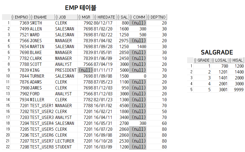 위의 그림과 같은 두 테이블이 있고, GRADE 가 5 인 사원들을 EMP 테이블에서 지워야 한다.