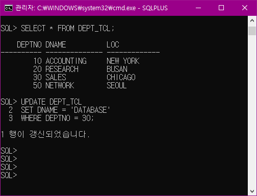 -- SQLPlus에서 UPDATE문 실행