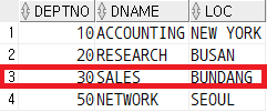 SQL developer 세션의 LOCK이 풀린 후 SQLPlus세션의 UPDATE 문이 실행되었지만 아직 COMMIT 을 하지 않은 상태이기 때문에 SQLPlus의 세션에서만 DEPTNO 30 행의 DNAME 이 DATABASE 로 출력된 것을 확인할 수 있다.