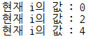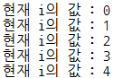 시작 값인 0 부터 4 까지 5 번 반복하고, 반복이 진행됨에 따라 카운터인 i 값이 증가하는 것을 확인할 수 있다.
