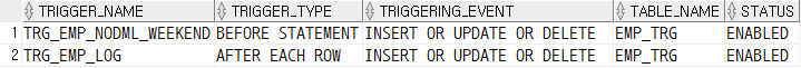 SELECT TRIGGER_NAME, TRIGGER_TYPE, TRIGGERING_EVENT, TABLE_NAME, STATUS