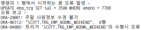 주말에 DML 명령어가 실행되면 트리거가 오류를 발생시켜 오류 메시지와 함께 DML 명령어가 취소된다.