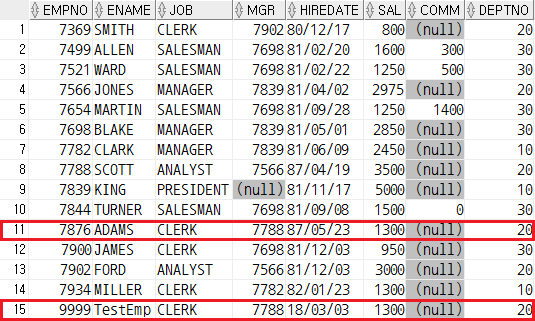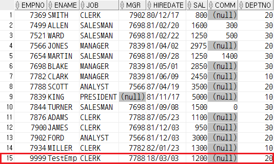 VALUES(9999, 'TestEmp', 'CLERK', 7788, TO_DATE('2018-03-03', 'YYYY-MM-DD'), 1200, NULL, 20);