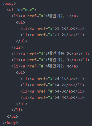 나중에 메뉴에 스타일을 적용할 것이기 때문에 가장 바깥 <ul>에 "nav"라는 id를 만들어 줍니다.