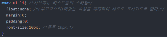 #nav ul li를 이용해서 서브메뉴 각 항목들의 스타일도 설정해 줍니다.