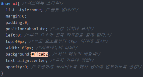 아까 설정한 #nav ul에 opacity속성을 추가하면 서브메뉴들을 투명하게 설정해서 평상시에는 안 보이도록 설정할 수 있습니다.