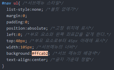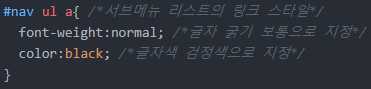 #nav ul a를 추가해서 서브메뉴의 링크 스타일을 지정해줍니다.