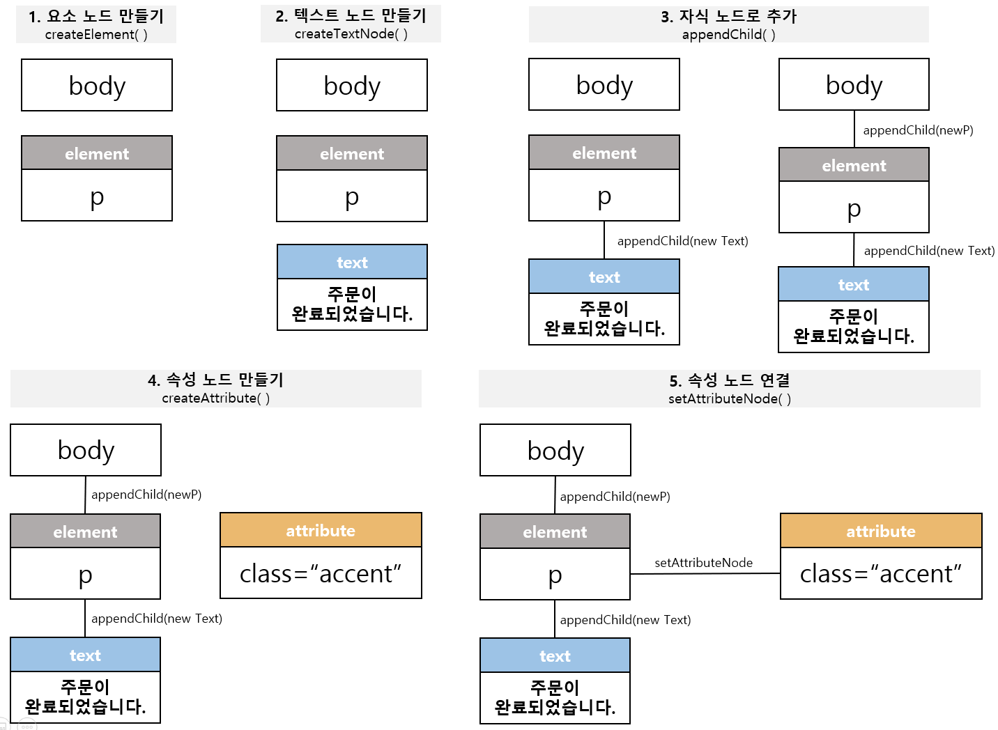 var newText = document.createTextNode("주문이 완료되었습니다.");