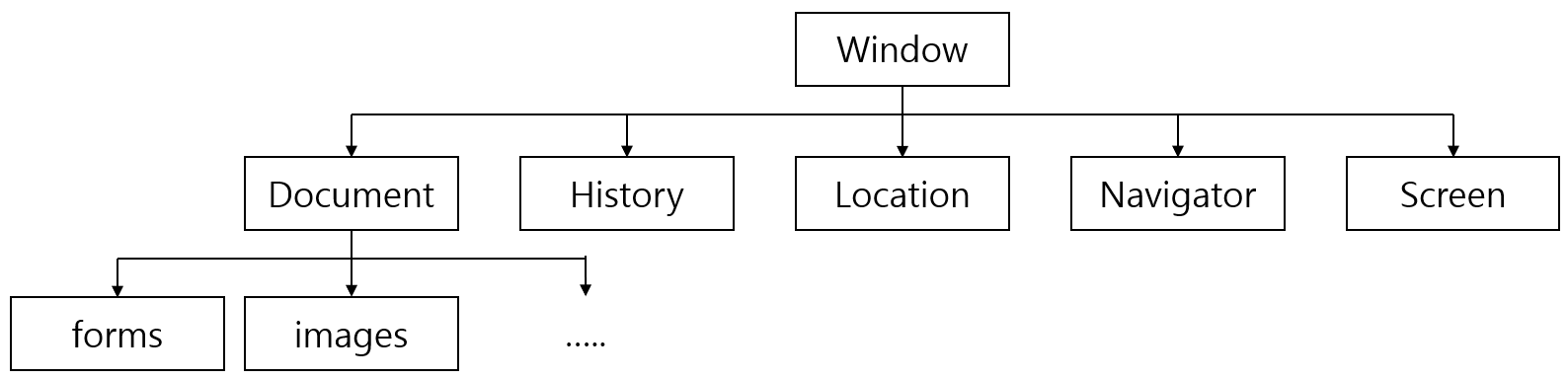 브라우저 창이 열리면 가장 먼저 Window 객체가 만들어지고, 그 하위에 브라우저 각 요소에 해당하는 객체가 만들어진다. 이들은 웹 문서(DOM을 사용해 제어)와 주소 표시줄처럼 브라우저의 각 요소에 해당하는 객체이고 각자 또 다른 하위 객체를 갖는다.