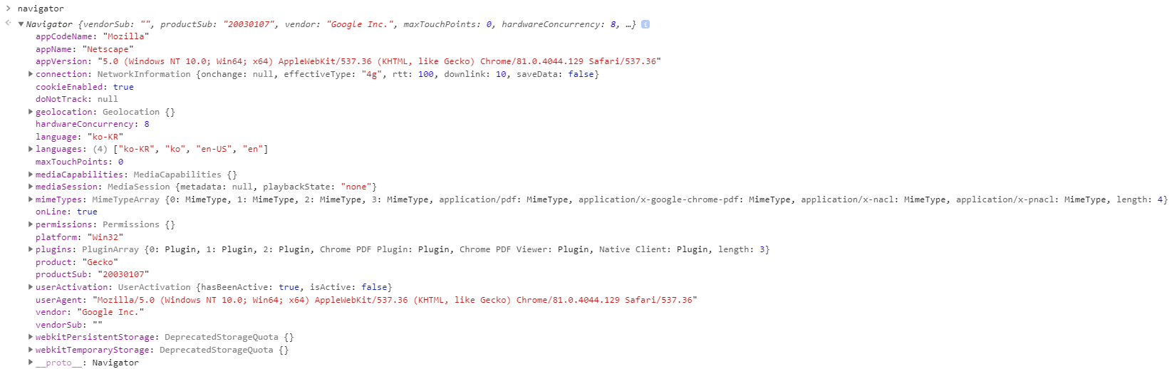 console 창에서 navigator 라고 치면 Navigator 객체의 모든 정보가 한 번에 표시된다.