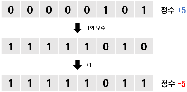 - 1의 보수법 : bit만 반대로 전환(`` 0 `` → `` 1 ``, `` 1 `` → `` 0 ``)