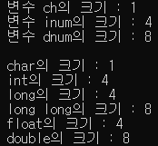 printf("long의 크기 : %d \n", sizeof(long));