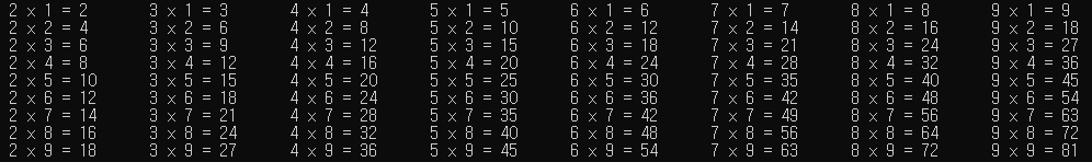 printf("%d x %d = %d \t", dan, num, dan*num);