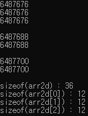위의 예시로 설명하면 ``arr2d``와 ``arr2d[0]``의 출력 결과는 같지만, ``arr2d``는 첫 번째 요소를 가리키면서 배열 전체를 의미하는 반면, ``arr2d[0]``은 첫 번째 요소를 가리키되 1행만을 의미하기 때문에 서로 다른 것이다. ``sizeof`` 연산하면 결과값이 다른 것을 확인할 수 있다.