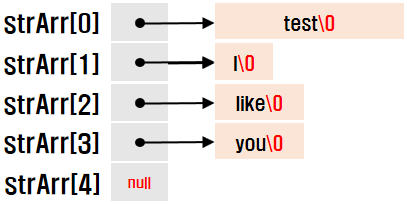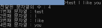 공백이 문자열을 나누는 기준이 되며(마찬가지로 문자열 배열(@@char *@@형 배열)이기 때문에 위의 그림처럼 각 문자열의 끝에 @@NULL(\0)@@문자가 들어가고, 배열의 마지막에도 @@NULL@@이 들어간다. "I Like You"와 같이 @@"@@로 묶으면 공백을 포함하는 문자열을 인자로 전달할 수 있다. 위의 예시에서 첫 번째 문자열(``argv[0]``)인 ``test``는 C 코드가 컴파일되고 난 후 생성된 exe 실행파일이다.(``test.exe``)