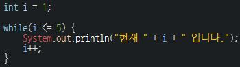 아까 for 문에서 나온 예시를 while 문으로 바꿨다. 초기화 식을 while{ } 안에 넣으면 매번 초기화되어서 반복문을 빠져나오지 못하게 되므로 외부에 선언했고, 반복문을 제어할 증감식이 필요해서 while{ } 내부에 i++ 를 넣었다.