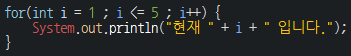 위의 반복문은 i 는 1 로 초기화되고 1 씩 증가해서 5 보다 작거나 같을 때까지 for 문 블럭 { } 안에 있는 print 문을 실행할 것이다.