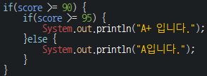 중첩 if 문을 사용해서 score 가 90 점 이상인 사람들 중 95 점이 넘으면 A+를 주고,