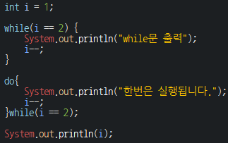 반면에 do-while 은 조건식이 false 지만 do{ } 내용을 최소 1번은 수행하기 때문에 do{ } 의 내용대로 print 문이 실행되고 i 에서 1 이 감소되어 do-while 이 끝나고 i 를 출력했을 때 0 이 출력된다.