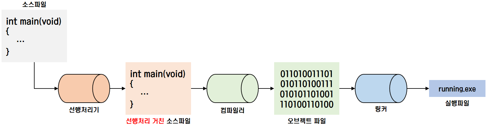 위의 그림에서 선행 처리는 선행 처리기에 의해, 컴파일은 컴파일러에 의해, 링크는 링커에 의해 진행된다. 컴파일 이전에 소스파일은 선행 처리과정을 거치는데 이 과정은 프로그래머가 삽입해 놓은 선행 처리 명령문대로 소스코드의 일부를 수정(대부분 단순 치환(substitution)하는 형태)하는 작업이다. (선행 처리기에 의해 변환되는 과정 자체를 가리켜 매크로 확장(macro expanision)이라고 한다.) 또한 선행 처리해도 여전히 소스파일이며, 컴파일 과정을 거쳐야 바이너리 데이터로 이루어진 오브젝트 파일이 생성된다.