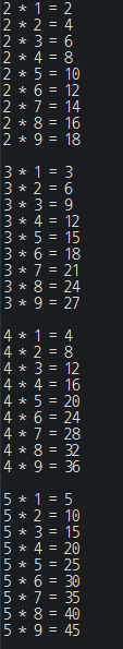1번의 방법에서는 2단을 출력하고 3단으로 넘어가는 식이었지만 이번에는 2단부터 9단까지 한줄씩 출력해야 하기 때문에 i 와 j 의 값을 바꿔준뒤 줄바꿈을 하는 형식으로 바꿔준다.