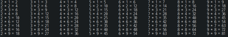 System.out.print(j + " * " + i + " = " + i * j + "\t"); //\t는 8칸을 띄워주는 역할이다.