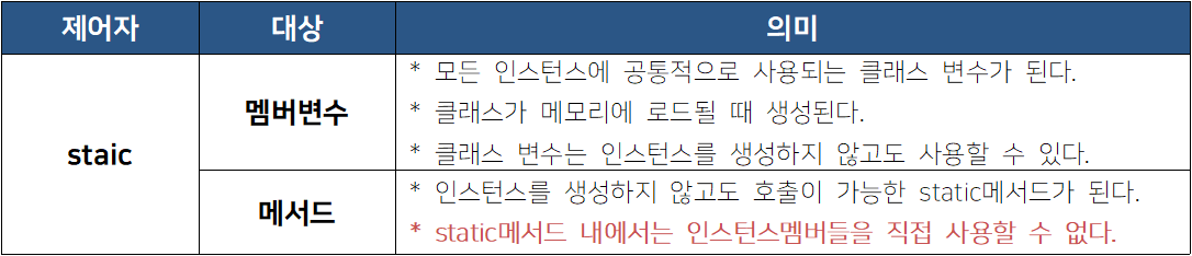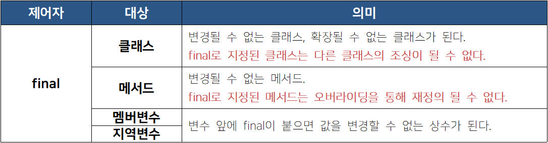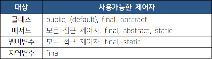 제어자는 클래스나 변수, 메서드의 선언부에 함께 사용되어 부가적인 의미를 부여한다. 제어자는 클래스나 멤버 변수, 메서드에 주로 사용되며 하나의 대상에 대해 여러 제어자를 조합하여 사용하는 것이 가능하다. 단, 접근제어자는 위의 표에 있는 4개 중 1개만 사용할 수 있다.