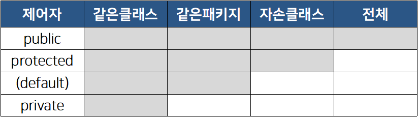 접근제어자가 사용될 수 있는 곳 : 클래스, 멤버 변수, 메서드, 생성자 public : 접근 제한이 없음 |
