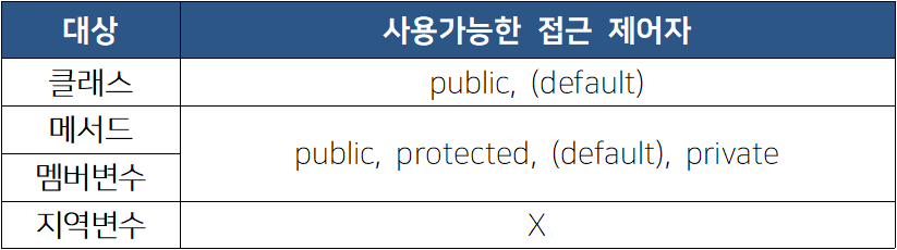 접근제어자는 멤버 또는 클래스에 사용되어 해당하는 멤버 또는 클래스를 외부에서 접근하지 못하도록 제한한다. 접근 제어자가 default 임을 알리기 위해 실제로 default 를 붙이지는 않지만 클래스나 멤버 변수, 메서드, 생성자에 특정한 접근제어자가 지정되어있지 않다면 기본적으로 default 가 된다.