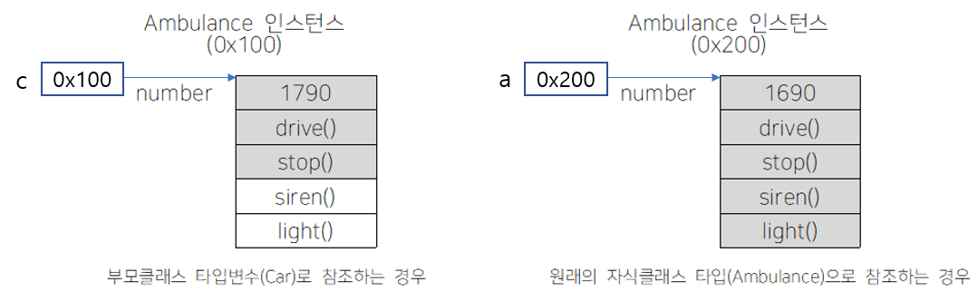 ( c 는 Car 타입의 참조 변수이고, a 는 Ambulance 타입의 참조 변수이다.)
