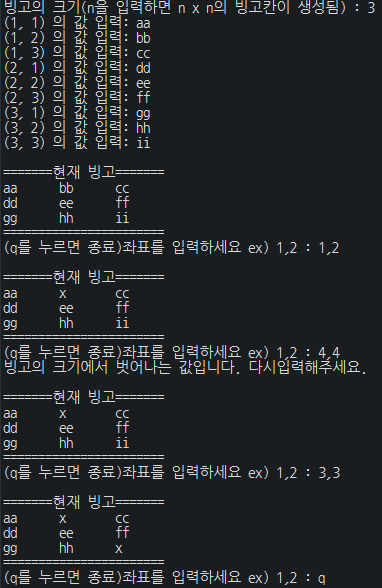 크기를 입력받아서 해당 크기만큼의 2차원 배열을 생성한 다음에 for 문을 사용해서 각 빙고 값에 해당하는 값을 입력받는다. 입력이 모두 끝나면 for 문을 이용해서 전체 빙고판을 출력하고 좌표를 입력받아서 해당 좌표의 값을 x 로 바꾸는 과정을 while 문으로 무한히 반복한다. if 문을 사용해서 q 나 Q 를 입력하면 프로그램이 종료된다. 사용자가 배열의 값을 벗어나는 좌표를 입력하는 경우는 try - catch 문으로 예외처리를 해서 값을 다시 입력하도록 처리했다.