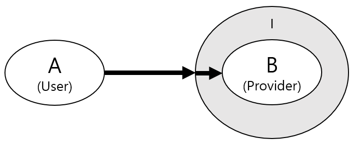 인터페이스 I 는 실제 구현 내용(클래스 B )를 감싸고 있는 껍데기이며, 클래스 A 는 껍데기 안에 어떤 알맹이(클래스)가 들어있는지 몰라도 된다.