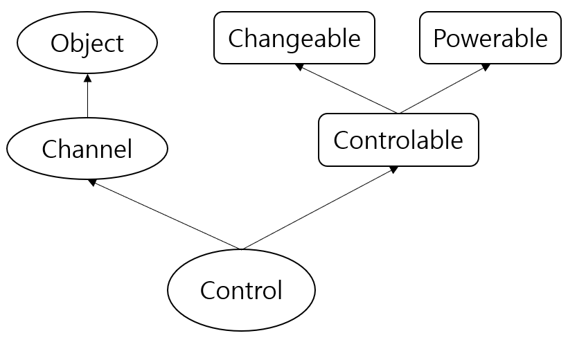 예시로 든 코드의 관계도를 그리면 위와 같다. 실제로 Control 클래스는 Channel 클래스로부터 상속받고 Controlable 인터페이스만을 구현했지만 Channel 클래스는 Object 클래스의 자식이고, Controlable 인터페이스는 Changeable 과 Powerable인터페이스의 자식이므로 Control 클래스는 이 모든 클래스와 인터페이스의 자식이 되는 셈이다. 인터페이스는 상속 대신 구현이라는 용어를 사용하지만 인터페이스로부터 상속받은 추상 메서드를 구현하는 것이기 때문에 인터페이스도 조금은 다른 의미의 부모라고 할 수 있다.