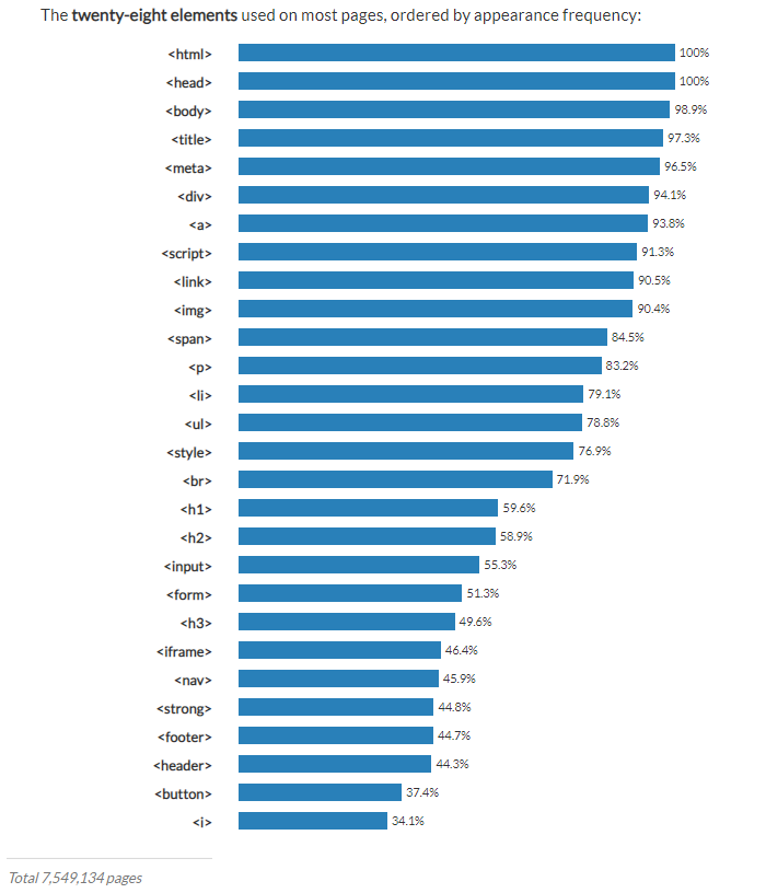 Apparently, an average web page uses twenty-eight different element types: The twenty-eight elements used on most pages, ordered by appearance frequency: