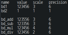 System.out.print("bd_add\t" + bd_add.unscaledValue() + "\t" + bd_add.scale() + "\t" + bd_add.precision() + "\n");