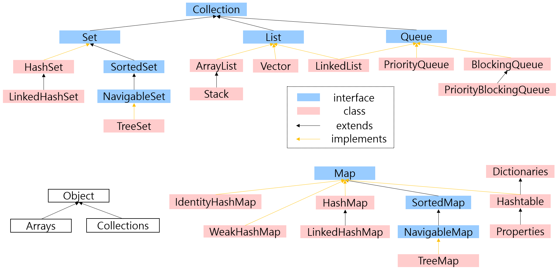 컬렉션 프레임 워크의 모든 컬렉션 클래스들은 List , Set , Map 중의 하나를 구현하고 있으며, 구현한 인터페이스의 이름이 클래스 이름에 포함되지만 Vector , Stack , Hashtable , Properties 와 같은 클래스들은 컬렉션 프레임워크가 만들어지기 이전부터 존재하던 것이기 때문에 컬렉션 프레임워크의 명명법을 따르지 않는다.