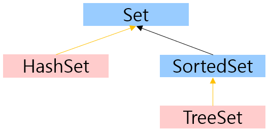 | Set | 순서를 유지하지 않는 데이터의 집합, 데이터의 중복을 허용하지 X | HashSet , TreeSet , SortedSet 등 |