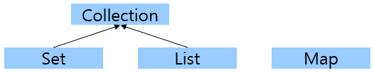 인터페이스 List 와 Set 을 구현한 컬렉션 클래스들은 공통부분이 많아서, 공통된 부분을 모은 Collection 인터페이스가 정의되어있다. Map 은 이들과 다른 형태로 컬렉션을 다루기 때문에 상속되지 않는다.