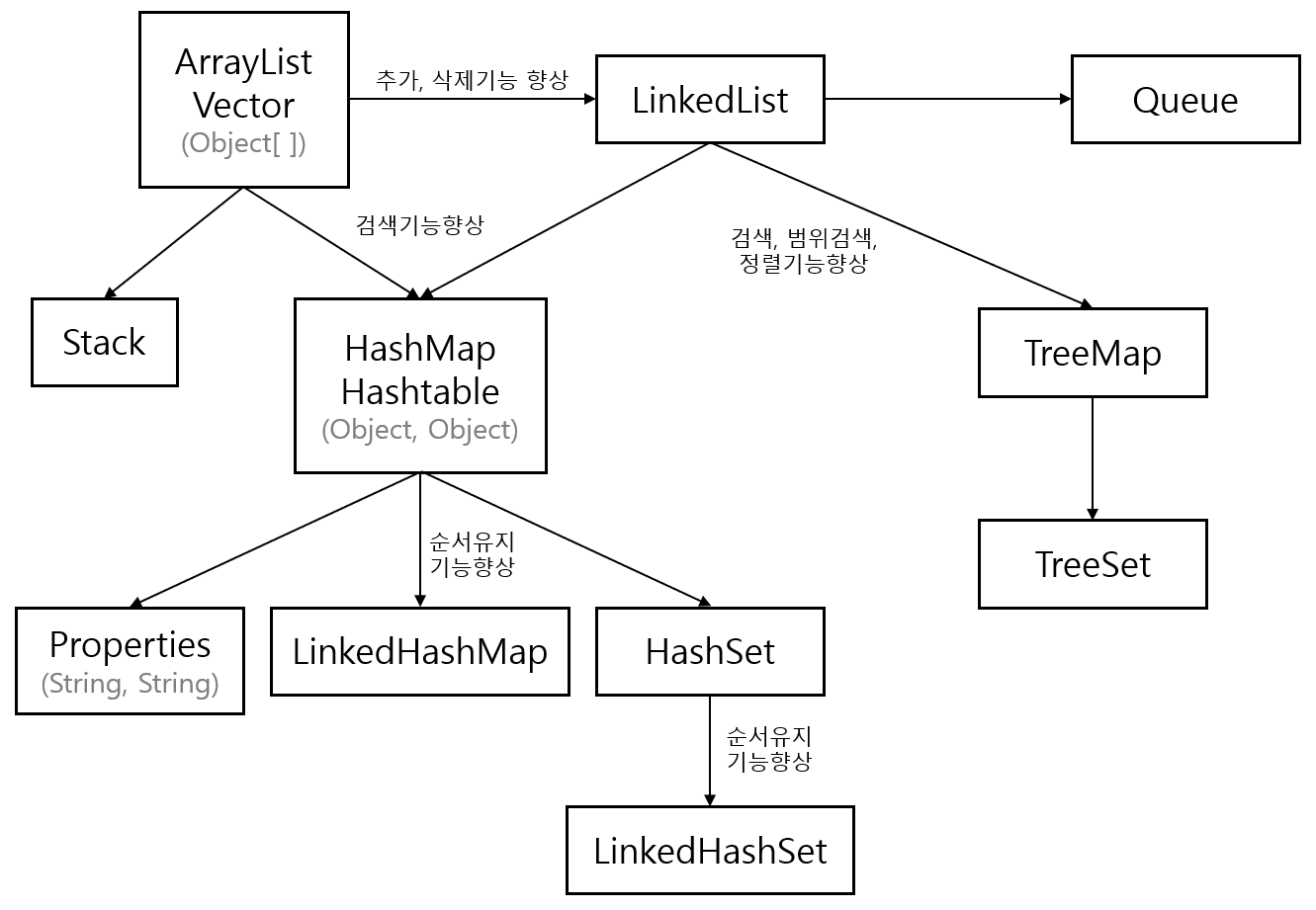 | HashMap | 배열과 연결이 결합된 형태. 추가, 삭제, 검색, 접근성이 모두 뛰어남. 검색에 최고의 성능 |