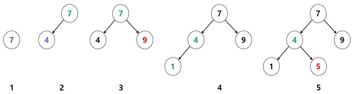 만약 이진 검색 트리에 7 , 4 , 9 , 1 , 5 순서대로 값을 저장하면 위의 그림과 같은 순서대로 진행된다. 첫 번째로 저장되는 값은 루트가 되고 두 번째 값은 트리의 루트부터 시작해서 값의 크기를 비교하면서 트리를 따라 내려간다. 자식 노드가 없을 경우 기준이 되는 값(초록색) 보다 작은 값은 왼쪽 노드(파란색), 큰 값은 오른쪽 노드(빨간색)에 배치된다. 이런 식으로 값을 채워나가면 최종 트리에서 왼쪽 마지막 레벨이 제일 작은 값( 1 )이 되고, 오른쪽 마지막 레벨의 값이 가장 큰 값( 9 )이 된다. 위의 예시는 숫자라서 쉽게 비교할 수 있지만 객체 간의 비교 시에는 비교 기준이 필요하다. TreeSet 에 저장되는 객체가 Comparable 을 구현하던가 Comparator 를 제공해서 두 객체를 비교할 방법을 알려줘야 한다. 그렇지 않으면 TreeSet 에 객체를 저장할 때 예외가 발생한다.
