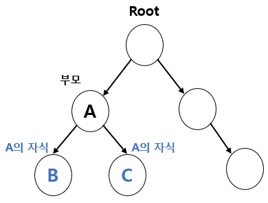 이진트리(binary tree)는 링크드 리스트처럼 여러 개의 노드(node)가 서로 연결된 구조로, 각 노드에 최대 2개의 노드를 연결할 수 있으며 루트(root)라고 불리는 하나의 노드에서 시작해서 확장해 나갈 수 있다. 위아래로 연결된 노드를 부모 - 자식관계 에 있다고 하며 위의 노드를 부모노드 , 아랫부분을 자식노드 라고 한다. 부모 - 자식관계 는 상대적이며 하나의 부모 노드는 최대 2개의 자식 노드와 연결될 수 있다. 예를 들어 A 는 B 와 C 의 부모 노드이고, B 와 C 는 A 의 자식 노드가 된다.