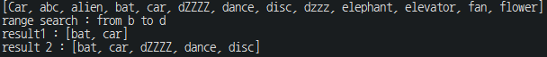 TreeSet 의 문자열 정렬 방식을 확인하는 예제이다. 소문자보다 대문자를 우선시하기 때문에 Car 가 abc 앞에 있고, dZZZZ 가 dzzz 보다 앞에 있는 것을 확인할 수 있다. 이처럼 대소문자가 섞여있는 경우에는 의도한 것과 다른 범위 검색 결과를 얻을 수 있다. 그래서 가능하면 대문자나 소문자 중 하나로 통일해서 저장하는 것이 좋다.(섞여있어야 하는 경우에는 Comparator 를 사용해야 함)