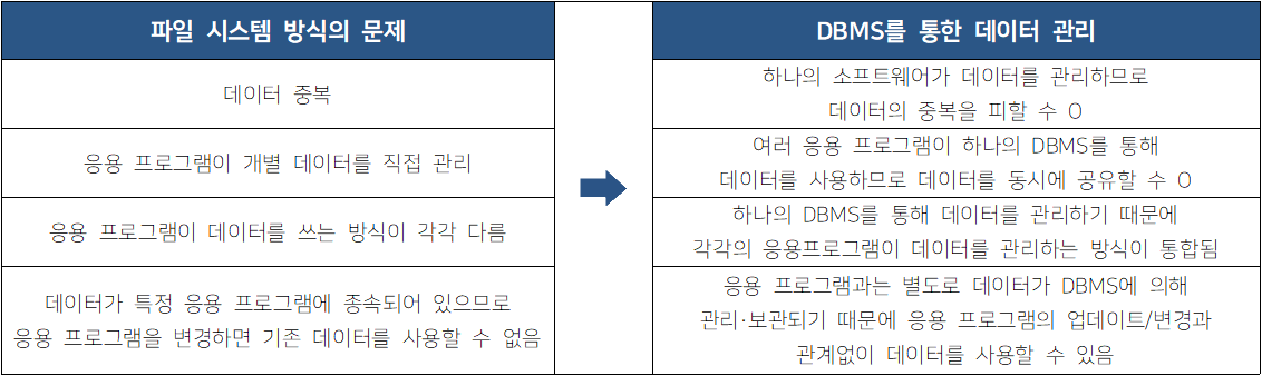 - 여러 목적으로 사용할 데이터의 접근/관리 등의 업무를 DBMS가 전담하는 방식