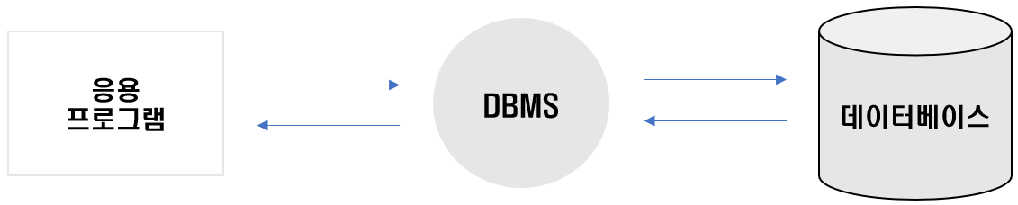 - 응용프로그램이 필요한 데이터 작업을 DBMS에 요청하면 DBMS는 자신이 관리하는 데이터베이스로 관련 작업을 수행하고 결과값을 제공한다.