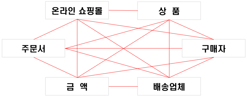 | 관계(relationship) | 개체와 개체 or 속성 간의 연관성을 나타내기 위해 사용 관계형 데이터베이스에서는 테이블 간의 관계를 왜래키(foreign key)등으로 구현하여 사용 |