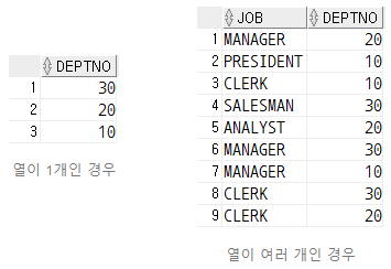 JOB 이름이 MANAGER 인 데이터들은 JOB 이름은 중복되지만, DEPTNO 까지 중복되지 않아서 제거되지 않은 것을 확인할 수 있다.