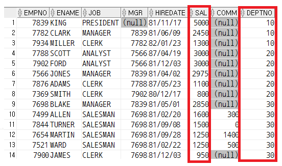 위의 코드처럼 사용하면 부서 번호( DEPTNO )를 오름차순으로 정렬하고, 부서 번호가 같은 사원일 경우 급여( SAL )를 기준으로 내림차순으로 정렬한다.